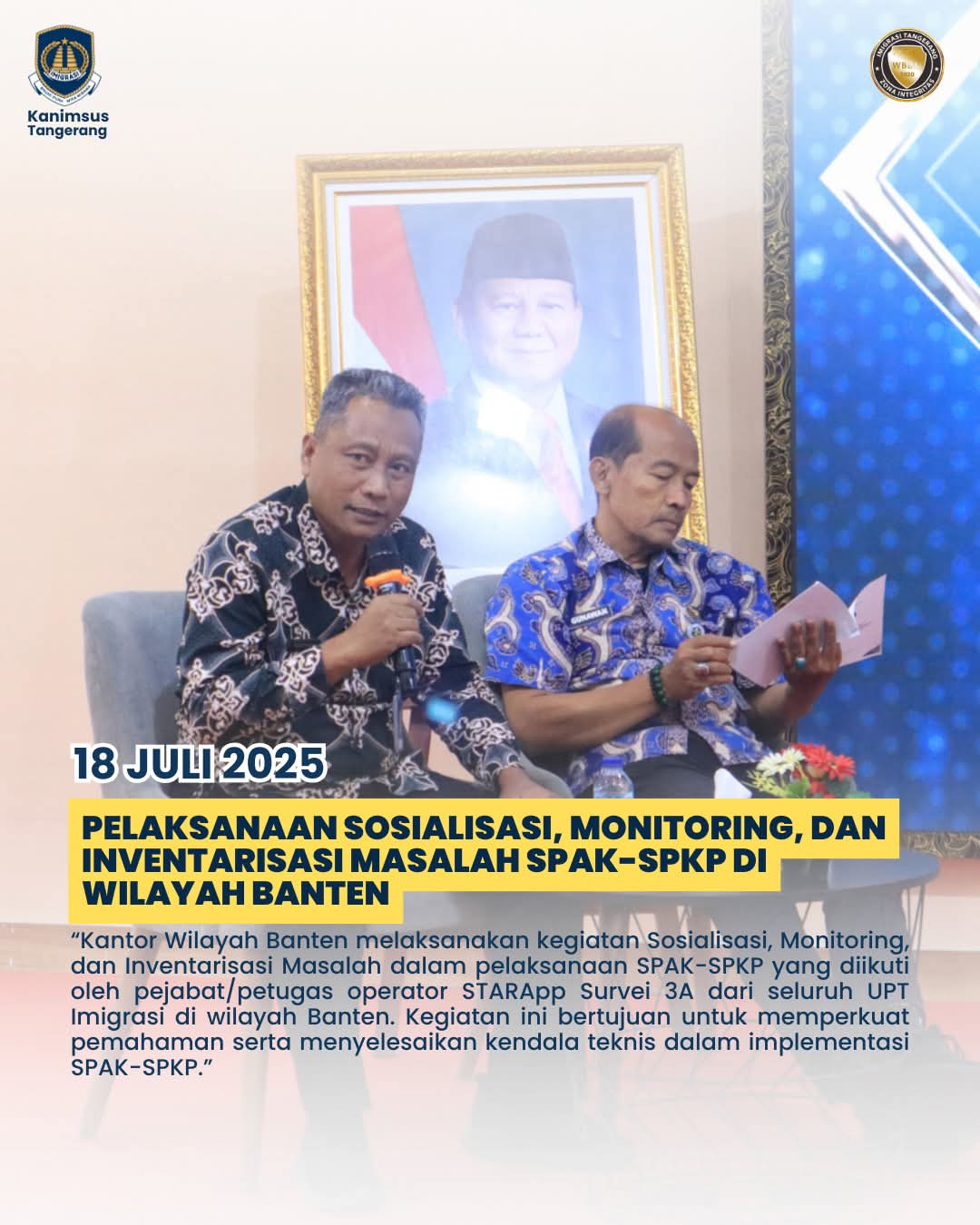 Operator STARapp 3A dari Kantor Imigrasi Kelas I Khusus Non TPI Tangerang turut berpartisipasi aktif dalam kegiatan ini, menunjukkan komitmen mereka terhadap peningkatan kualitas layanan dan pemberantasan korupsi di lingkungan kerja. Melalui sosialisasi ini, diharapkan seluruh operator dapat melaksanakan survei dengan lebih efektif, akurat, dan sesuai dengan pedoman yang telah ditetapkan.