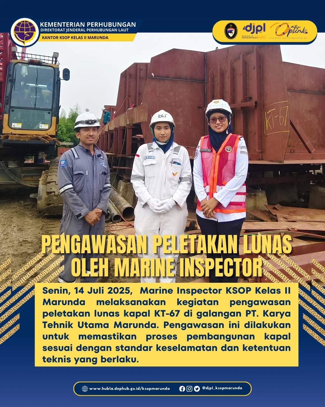 Jakarta, otoritas.co.id – Kantor Kesyahbandaran dan Otoritas Pelabuhan (KSOP) Kelas II Marunda, di bawah Kementerian Perhubungan Republik Indonesia, melalui Marine Inspector-nya, hari ini melakukan pengawasan ketat terhadap proses peletakan lunas kapal KT-67 di galangan PT. Karya Tehnik Utama Marunda. Pengawasan ini merupakan bagian dari komitmen berkelanjutan pemerintah untuk memastikan setiap pembangunan kapal memenuhi standar keselamatan dan ketentuan teknis yang berlaku.