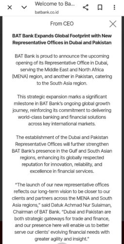 “Berdasarkan informasi yang beredar, termasuk dari materi yang ditampilkan dalam platform resmi ‘Bat Bank’, disebutkan bahwa entitas tersebut berdiri di Indonesia pada tahun 2019, dengan rencana pembukaan kantor perwakilan di Dubai dan Pakistan yang ditargetkan pada akhir tahun 2025. Namun hingga saat ini, keberadaan kantor perwakilan tersebut diduga masih dalam tahap wacana dan belum ditemukan verifikasi faktual yang dapat dikonfirmasi secara independen.”