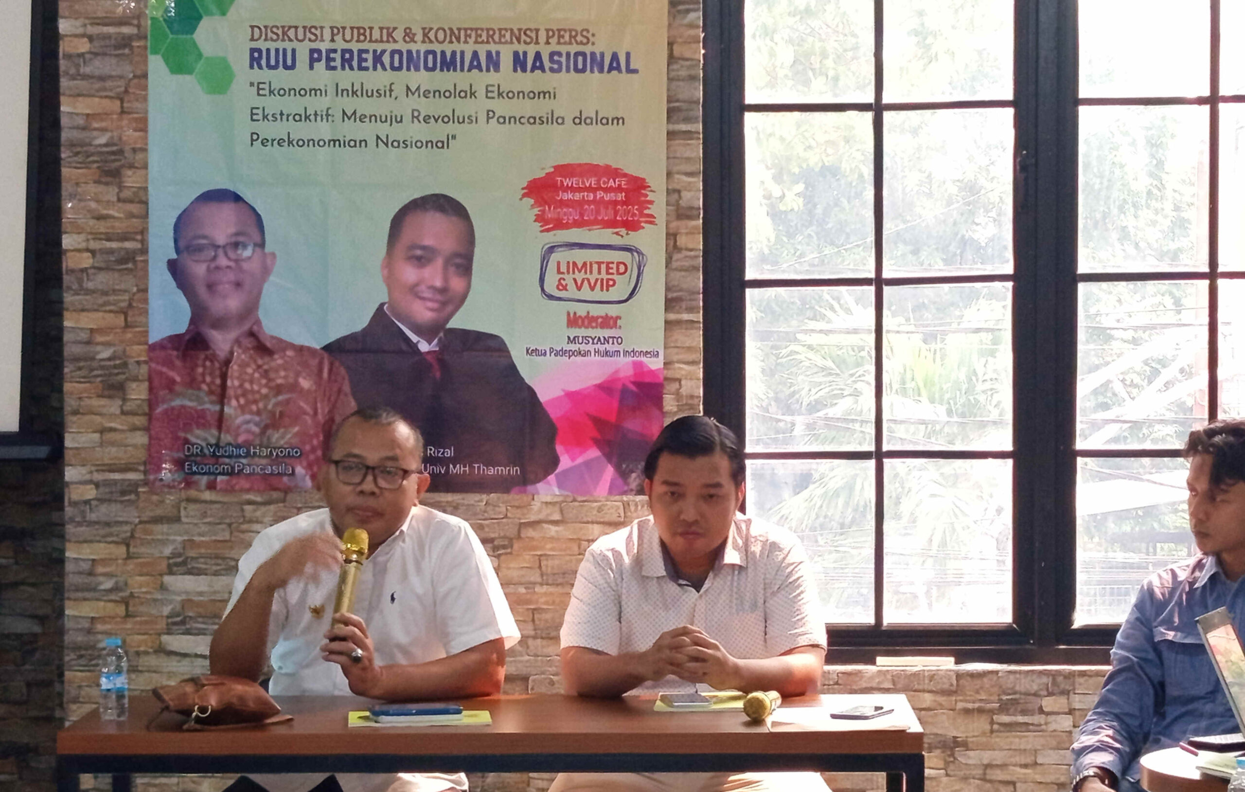 Jakarta, otoritas.co.id — Puluhan peserta dari berbagai kalangan akademisi, jurnalis, aktivis, dan organisasi masyarakat sipil menghadiri Diskusi Publik dan Konferensi Pers: RUU Perekonomian Nasional di Twelve Café, Johar Baru, Jakarta Pusat, pada Minggu 20 Juli 2025. Kegiatan ini mengangkat tema “Ekonomi Inklusif, Menolak Ekonomi Ekstraktif: Menuju Revolusi Pancasila dalam Perekonomian Nasional”.