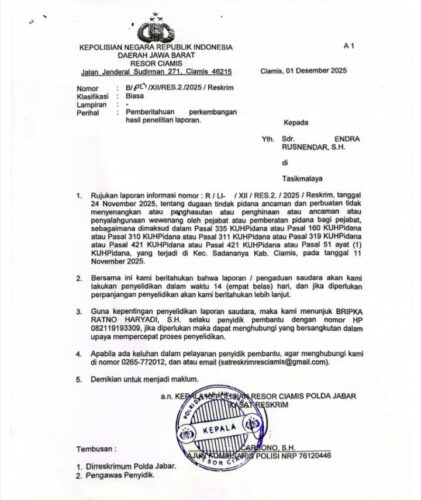 Pada 1 Desember 2025, pelapor bersama sejumlah wartawan dan perwakilan organisasi pers mendatangi Polres Ciamis untuk mengonfirmasi perkembangan laporan serta memastikan proses hukum berjalan sesuai prosedur. Saat ini, kasus tersebut telah masuk dalam penanganan pihak kepolisian.